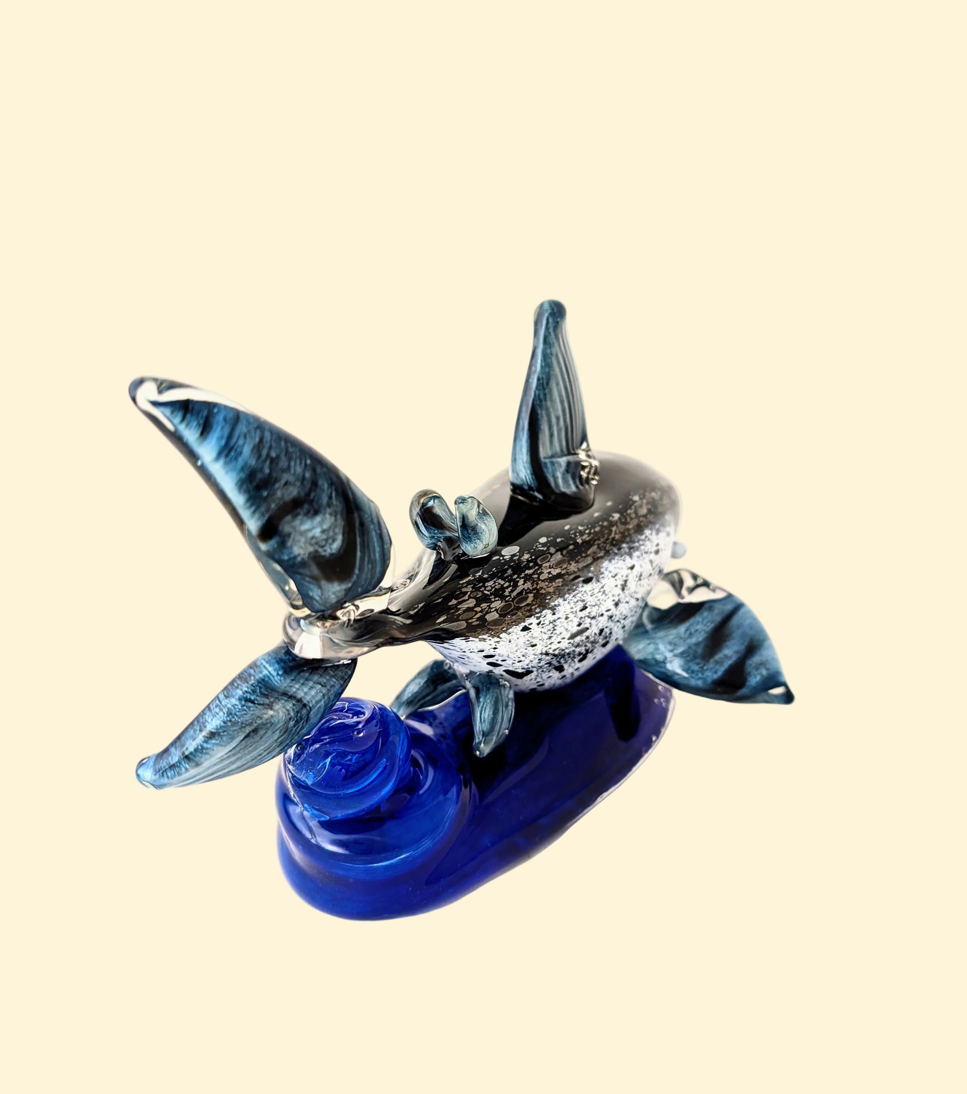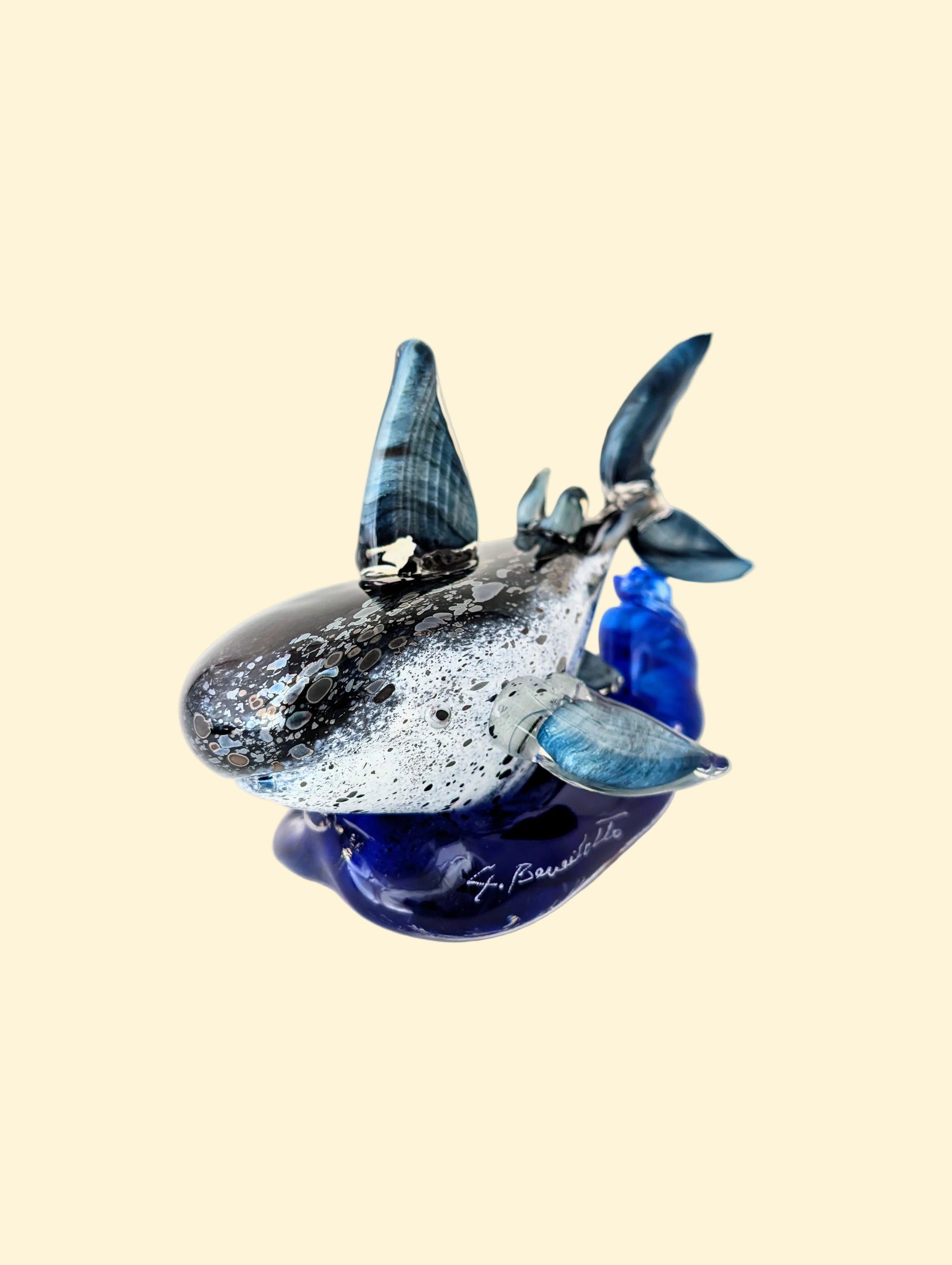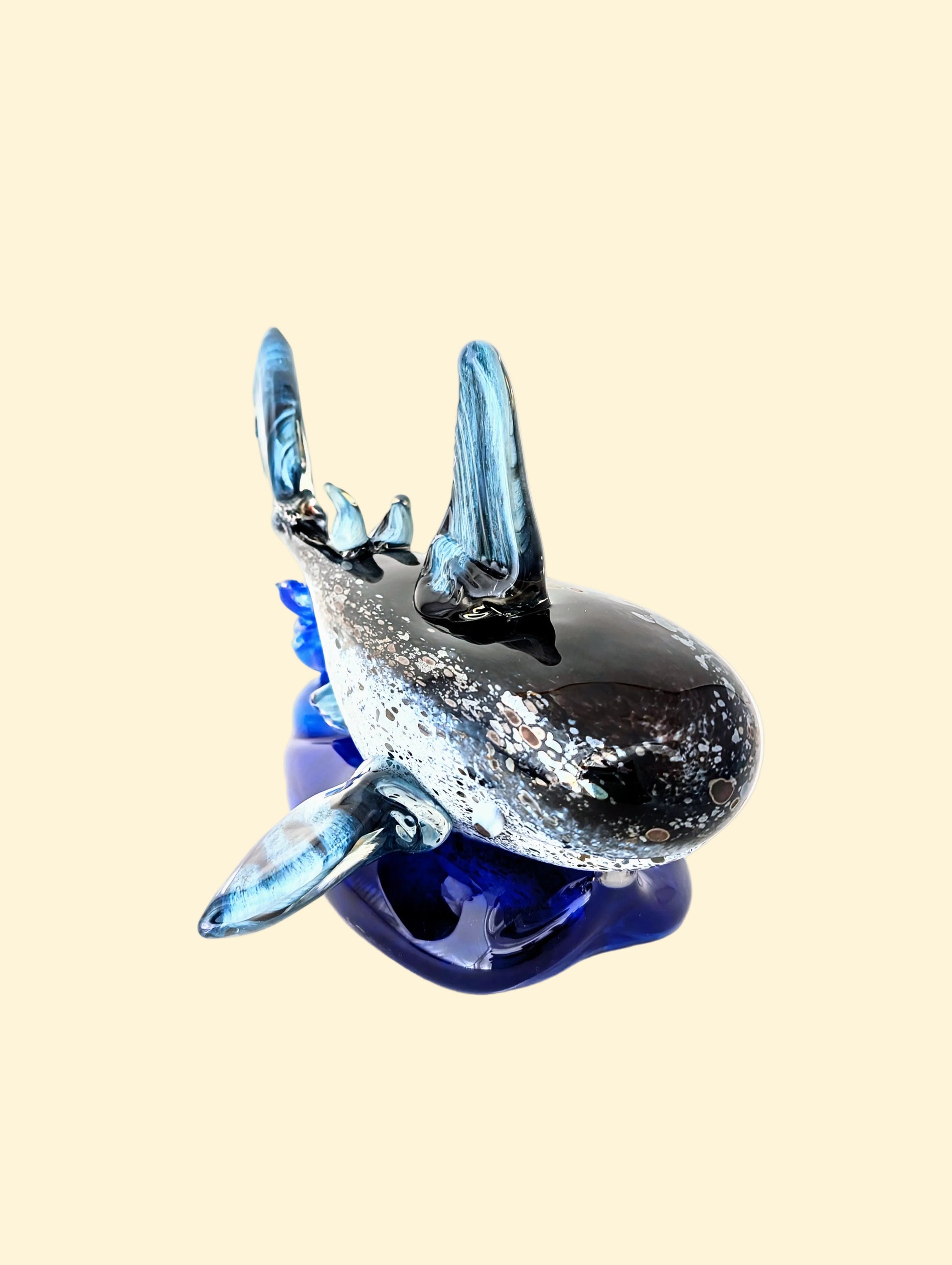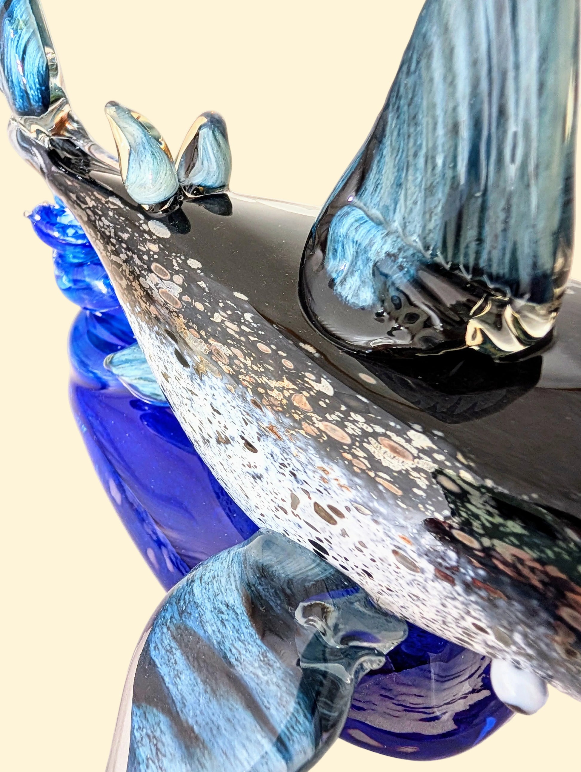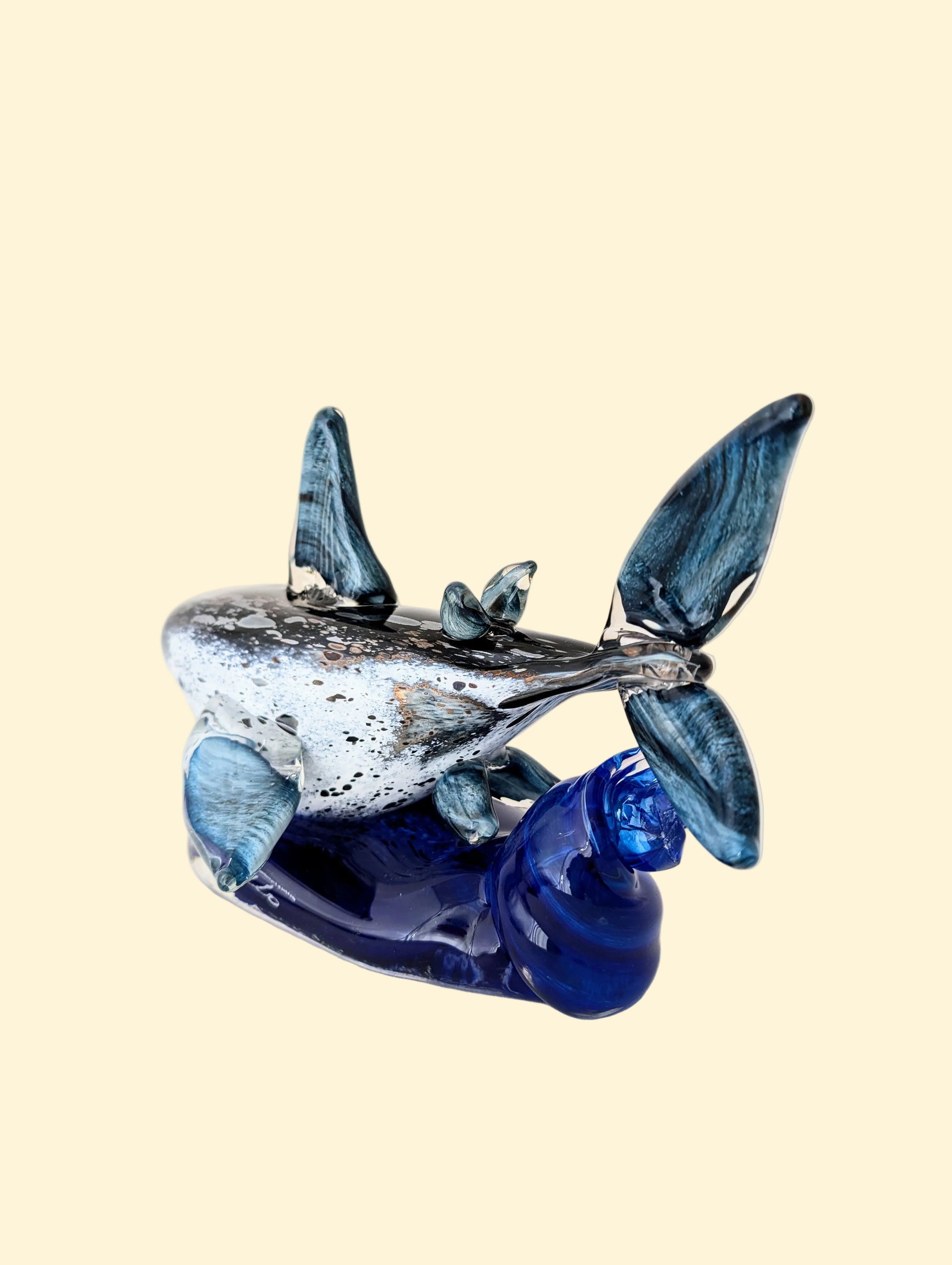 Sculpture de grand requin blanc en verre soufflé sur socle bleu.